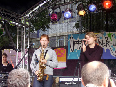 "Auf der Bühne haben wir uns nicht so unter Kontrolle. Alles ist doppelt so schnell und doppelt so laut", erzählt Josephine aufgekratzt. "Anfangs hatte ich den totalen Blackout", erinnert sich Keyboarderin Hannah Heise-Metzscher (14) an den fmz-Auftritt. "Aber als ich merkte, dass das Publikum unseren Hubschrauber-Song gut fand, war's o.k." In dem Lied, in dem Josephine wie eine Rotzgöre rappt und Sängerin Madita Standke-Erdmann (14) zur ("natürlich absichtlich") kindischen Melodie trällert, finden sich Versatzstücke von Trios "DaDaDa" über James Browns "I Feel Good" bis zu Jack Johnsons "Good People". "Das haben wir voll geklaut", sagt Josephine kichernd. Aber auch Klauen will gelernt sein. Die Songtexte schreiben die Mädchen im Team. Vom Tanzen handeln sie. Und davon, wie Hannah meint, "dass man mehr Selbstbewusstsein haben sollte".